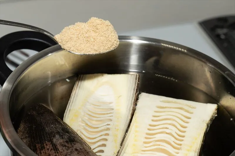 大きめの鍋に、タケノコがしっかり浸かる量の水を加え、ぬか・赤唐辛子と一緒に茹でるのがおすすめです。